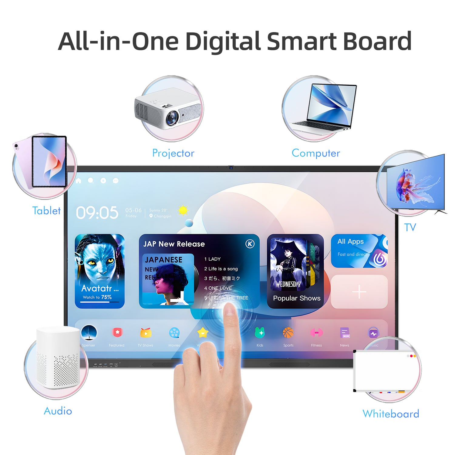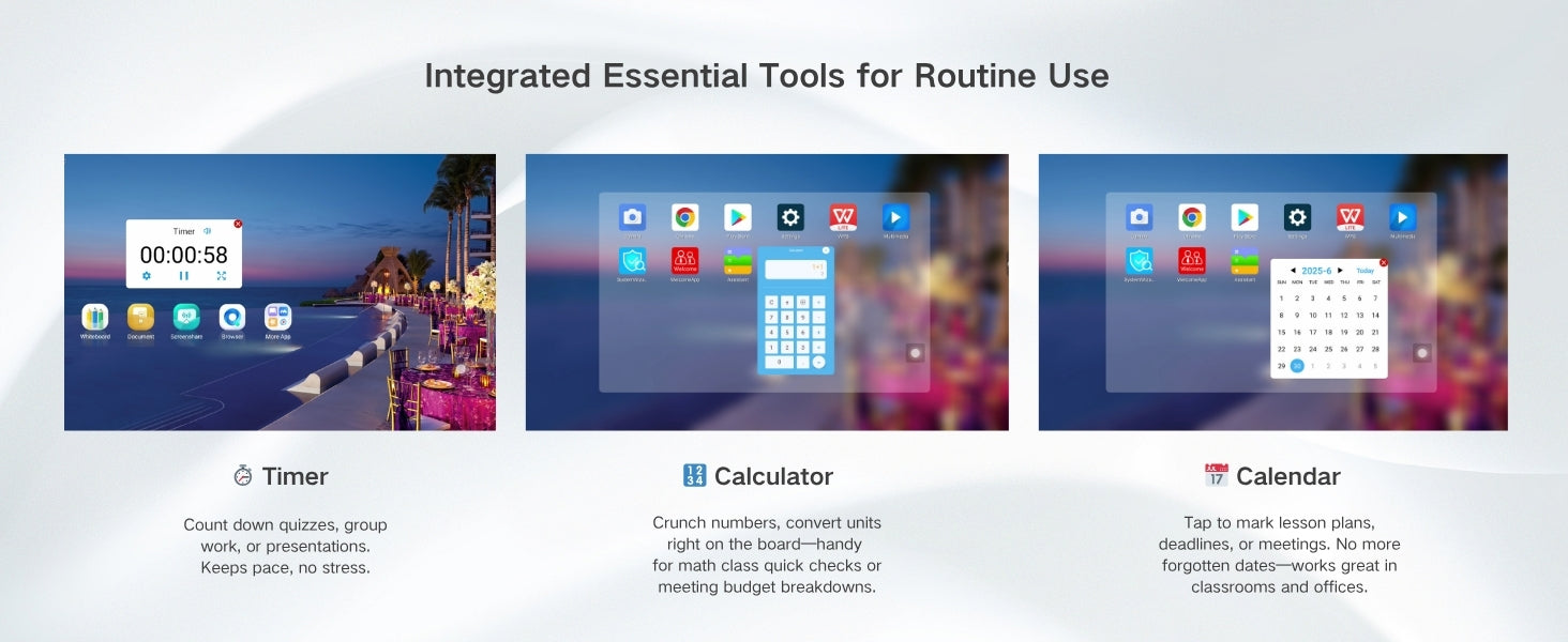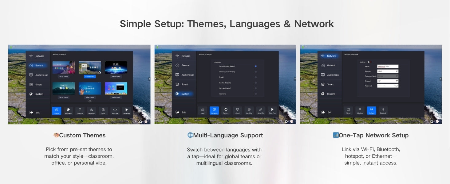 - MULTI-LANGUAGE INTERFACE : Pre-installed with 20+ languages, including English, Spanish, French, Deutsch,Italian,Portuguese,ect. Switch effortlessly to match diverse classrooms, international teams, or multilingual learning environments.it suits the smart board for home use, diverse classrooms, and international teams, switching effortlessly to match multilingual environments.