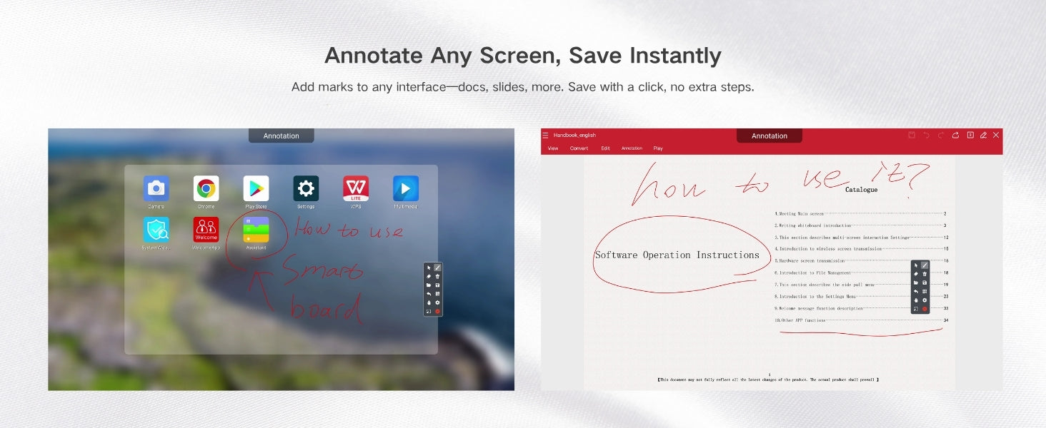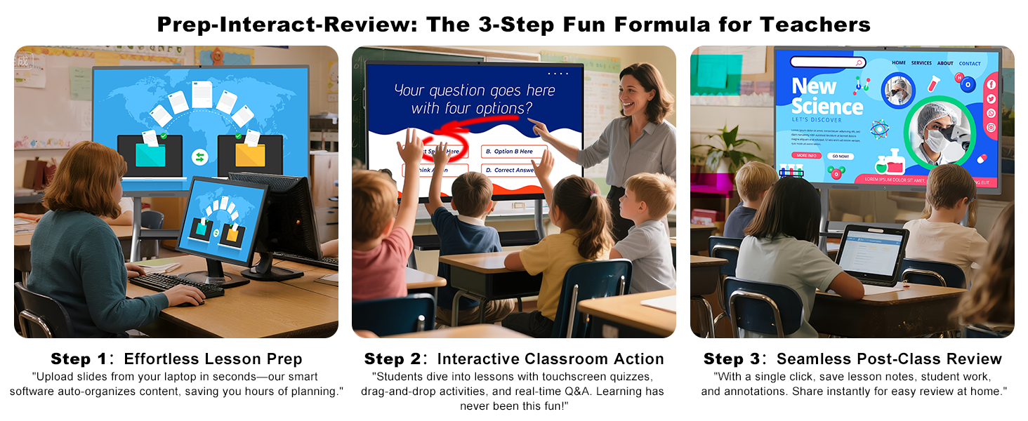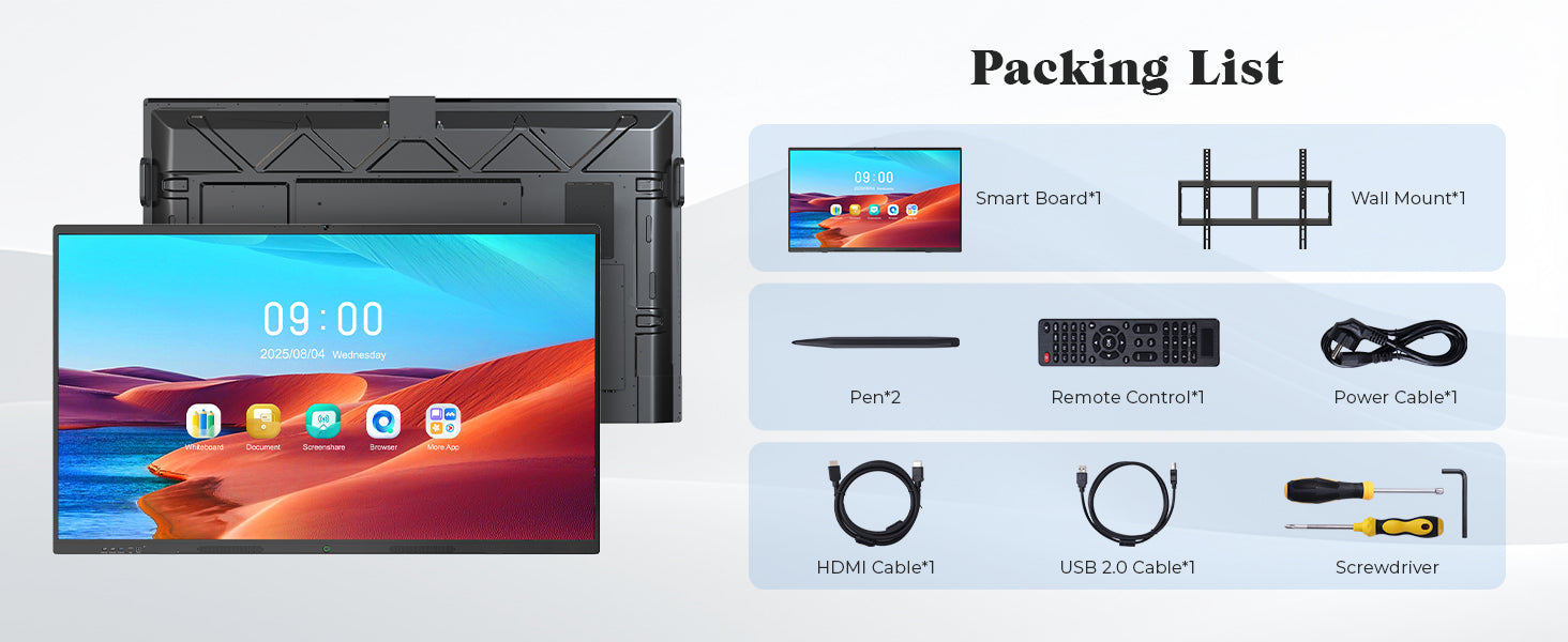 - ALL-IN-ONE TEACHING ASSISTANT : This smart board, a robust digital whiteboard, comes with tools like annotation features, split-screen functionality, and screen recording—plus instant text conversion and 10+ brush styles. It helps educators save prep time while creating interactive lessons that captivate students from elementary to high school, fitting any classroom vibe.