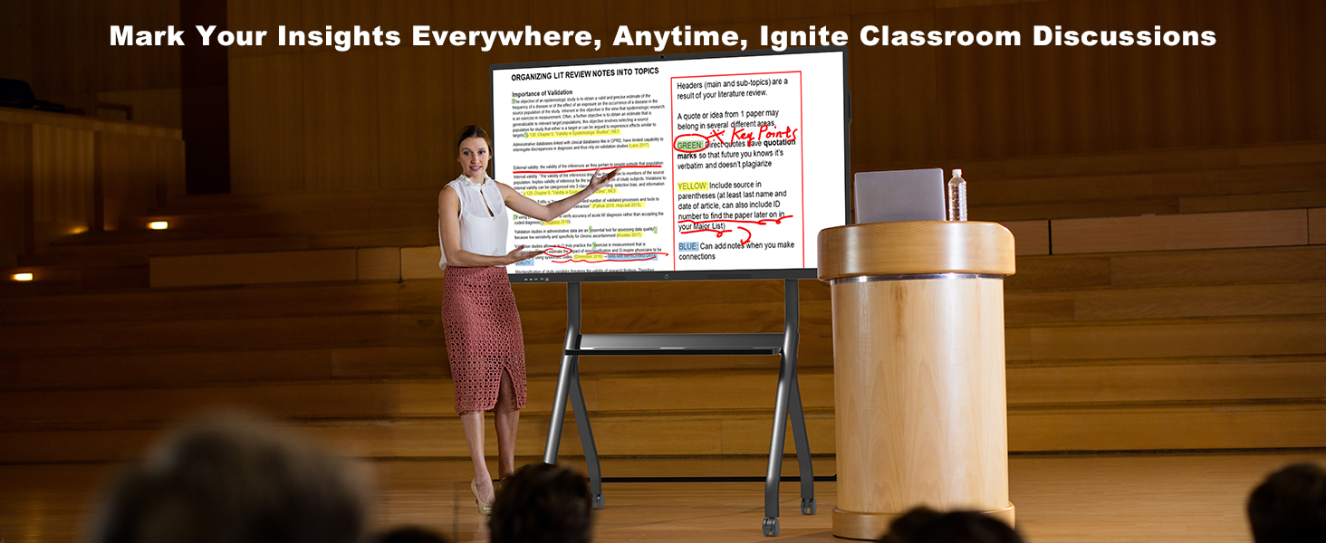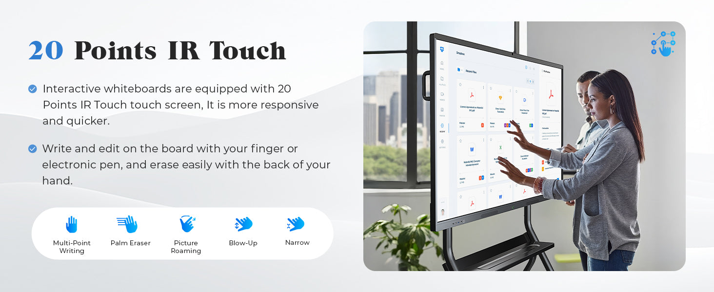 - INNOVATIVE INTERACTIVE EXPERIENCE : This interactive whiteboard features 20-point multi-touch with 8ms ultra-low latency, enabling real-time annotation on images, PDFs, and videos. Ideal for presentation board tasks like team brainstorming in offices or classroom group activities.
