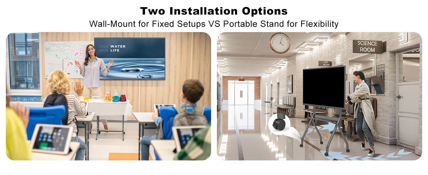 VIVID VISUAL ENGAGEMENT : With a 4K UHD display, 5000:1 contrast ratio, and 1.07B color range, this digital display board shows images, diagrams, and videos clearly. It works well for whiteboard tasks like explaining science concepts or sharing storytime visuals in nurseries, so kids can see details without straining.