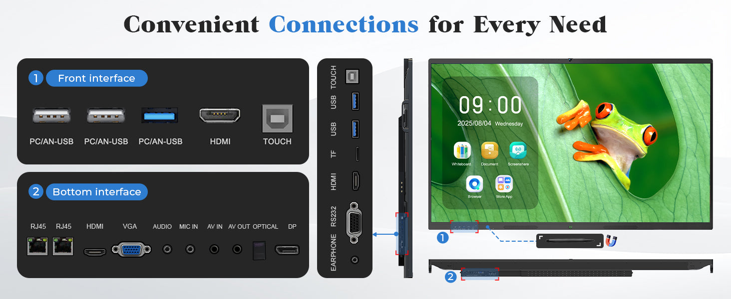 VERSATILE CONNECTIVITY HUB : This smart whiteboard, a key electronics piece, has a comprehensive port array—including TOUCH/USB/TF, HDMI/DP/VGA, Type-C/RJ45, and Audio/Mic/Optical. Connects touch pens, laptops, and more with plug-and-play ease, serving as a reliable board for classroom teaching or office meetings.