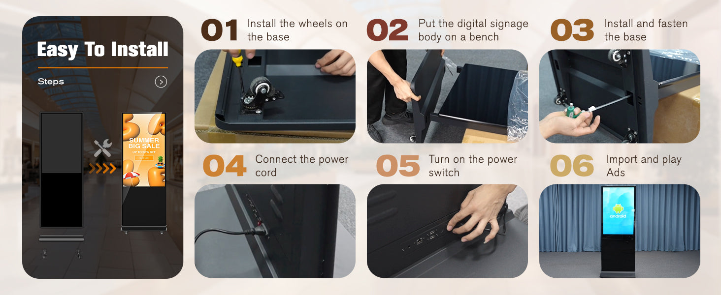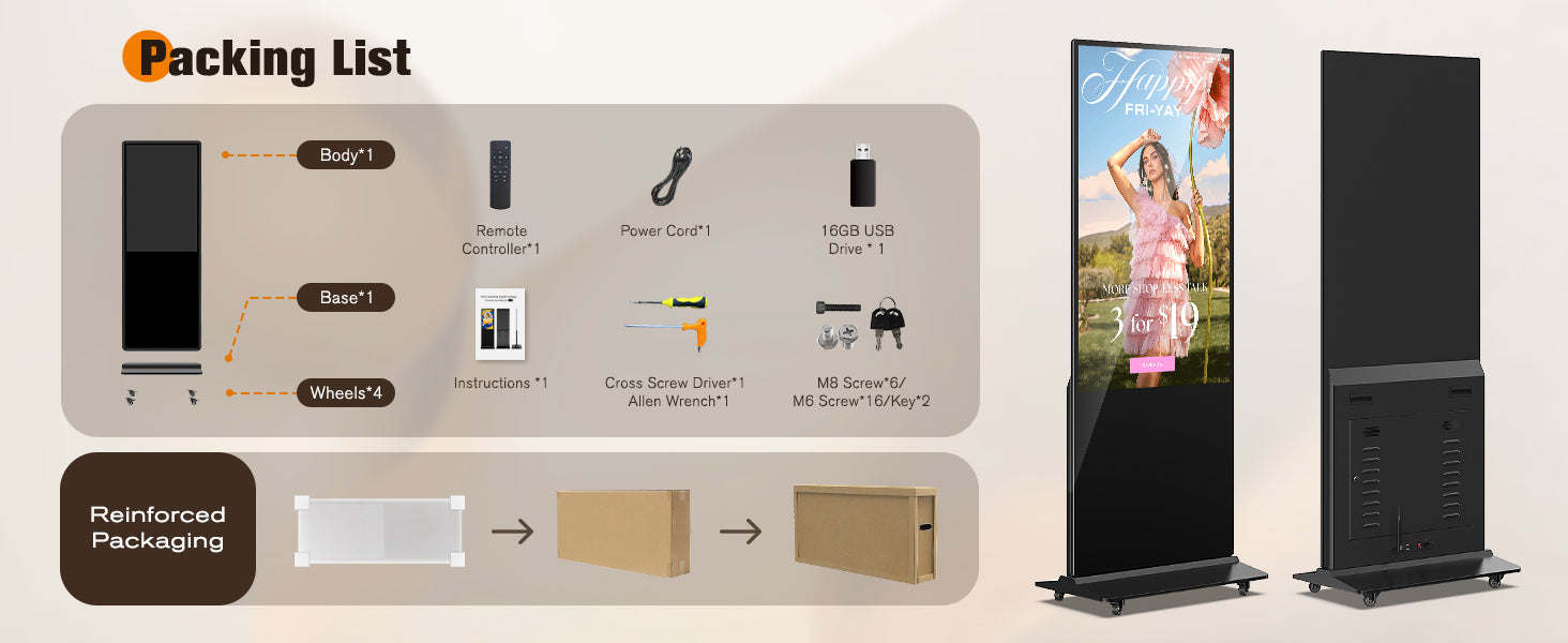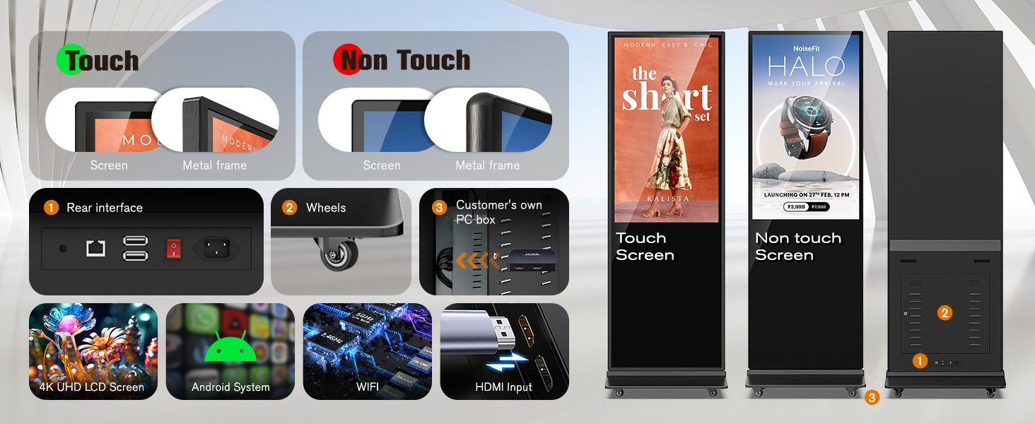 - VERSATILE SCENE APPLICATIONS: The freestanding advertising machine is designed for durability and sturdiness. It is widely used in high-traffic public places such as large shopping malls, supermarkets, hotel lobbies, restaurants, cinemas, retail stores, airports, and hospitals to display advertisements via large-screen terminal devices.
